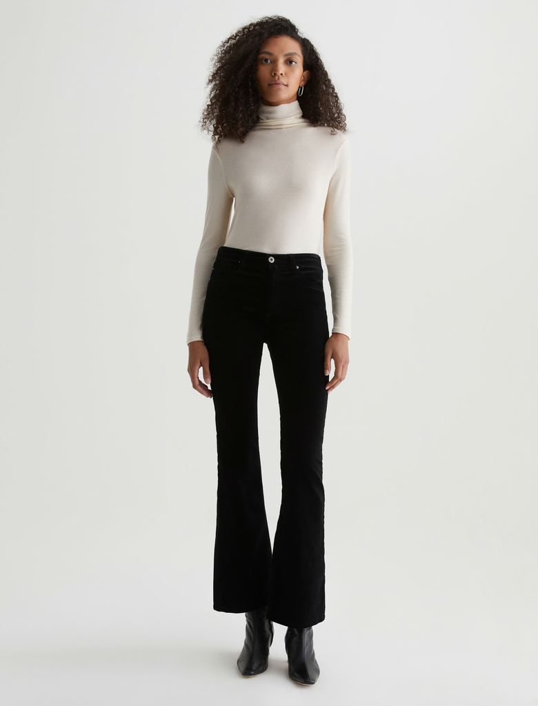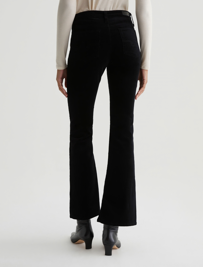 The Farrah Boot is a mid-rise bootcut silhouette crafted from 7.5 oz. Opulent Stretch Velvet in ultra-dark black. The pair sits right at the natural waist and has a skinny fit through the leg before opening into a subtly flared hem.