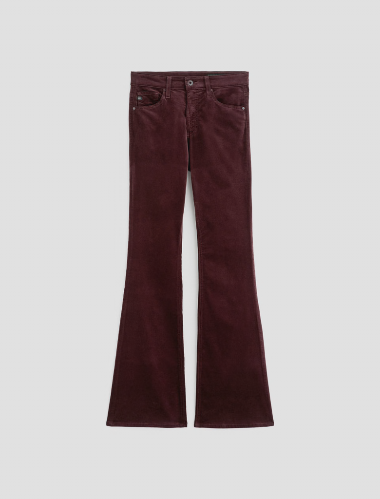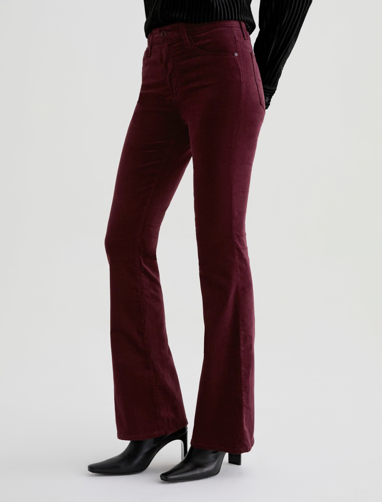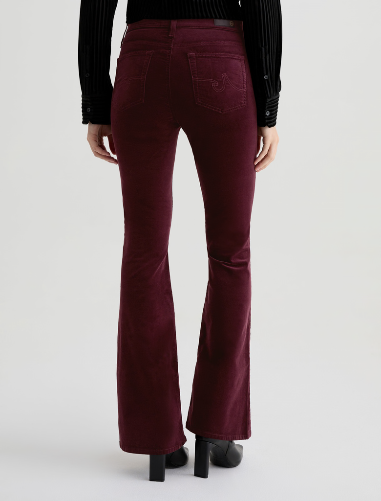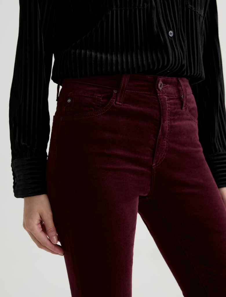 The Farrah Boot Velvet is a bootcut pant with a mid-rise waist and flattering silhouette. Features a fitted hip and thigh with a subtle flare from the knee down. Crafted from Soft Plush Velvet with a touch of stretch for all-day comfort and style. Shown here in winery.