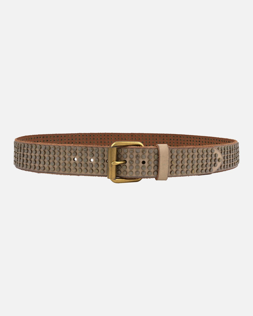 Add subtle glamour to your everyday look with the Camiel Leather Belt, adorned with a grid of antique brass studs for a refined, textured finish. Made from premium leather, this belt offers a soft neutral tone that pairs effortlessly with denim, trousers, or flowing dresses. The polished brass buckle adds a classic touch, while the all-over stud pattern brings a modern edge. Crafted for comfort, durability, and standout style, this belt is a versatile piece that blends elegance with effortless wearability.