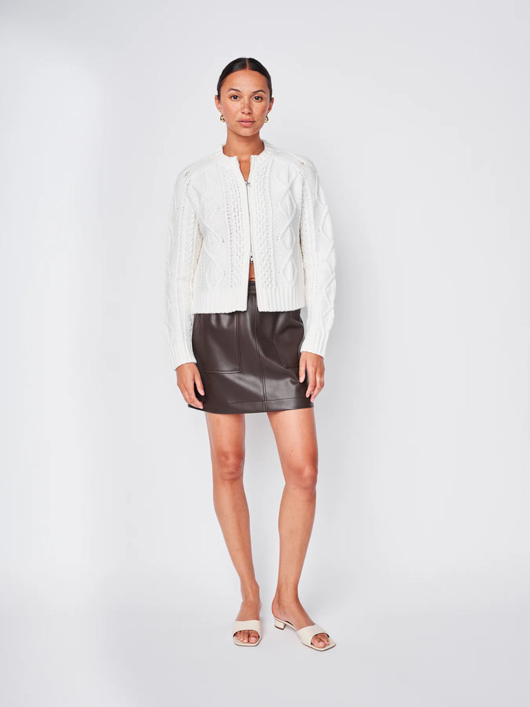 A modern cable‑knit cardigan in crisp ivory, this piece features sculptural stitched motifs, a clean crew neckline, and a subtly cropped, straight silhouette that skims the body for an effortlessly polished look. Designed with a minimalist front placket and refined rib trims.