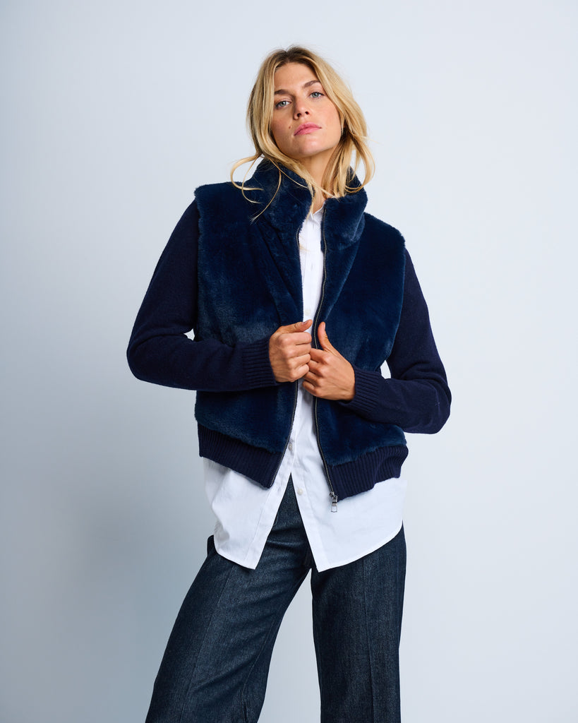 Cozy and stylish, this faux fur jacket features ultra-soft contrasting knit sleeves for added comfort and texture. Designed with a front zip closure and convenient side pockets, it’s perfect for layering and elevating your everyday look. Shown in Navy.