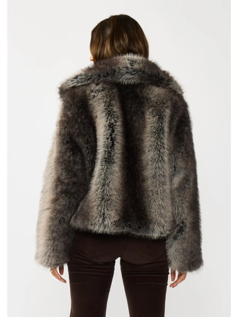Elevate your fall layering with this luxuriously soft faux fur jacket, designed in a striking charcoal-to-silver ombre that adds depth and dimension. The plush texture pairs beautifully with its smooth acetate lining for all-day comfort, while the shawl collar and long sleeves bring both warmth and sophistication. Finished with a clean straight hem, it’s a statement piece that transitions effortlessly from day to night.