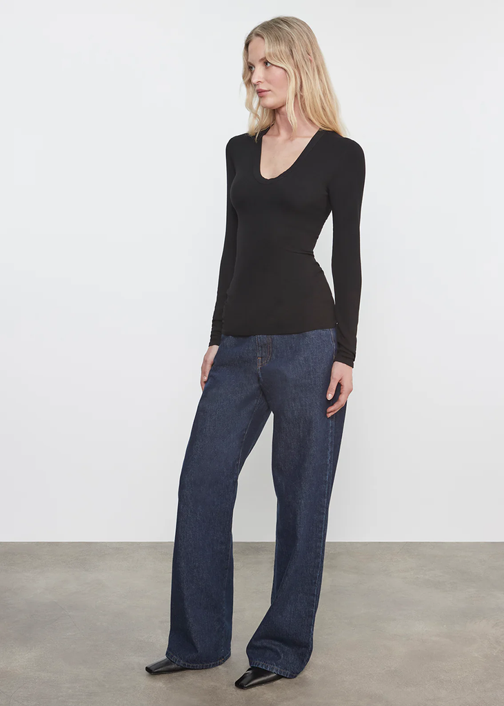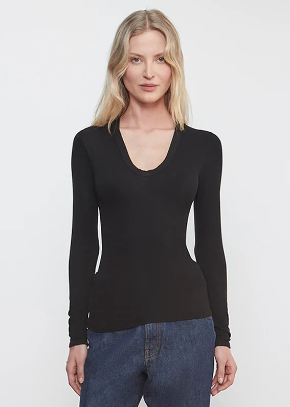 A slim long-sleeved U-neck in the best-selling silk rib fabric. Soft and luxurious, this piece is perfect for layering or on its own.